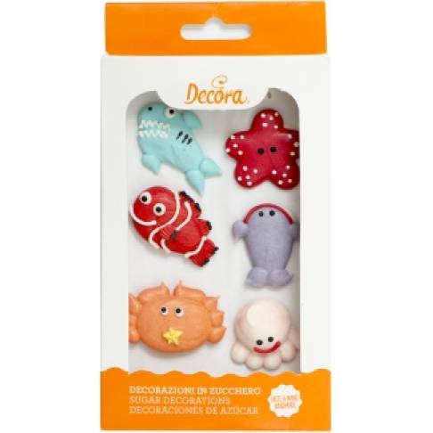 Rozmanitá zvířata: delfín, ryba, krab, atd. Ručně vyráběné cukrové dekorace. V praktickém blistru připraveném k použití. Barvy přirozené extrakce. Ozdobit těmito dekoracemi můžete jakýkoliv moučník, vždy bude vypadat originálně a zaujme především děti. Cukrové zdobení zvládne aplikovat i cukrář začátečník. Jsou také skvělé řešení, jak zapojit do práce i děti. V balení najdete 6 ks veselých tvarů.