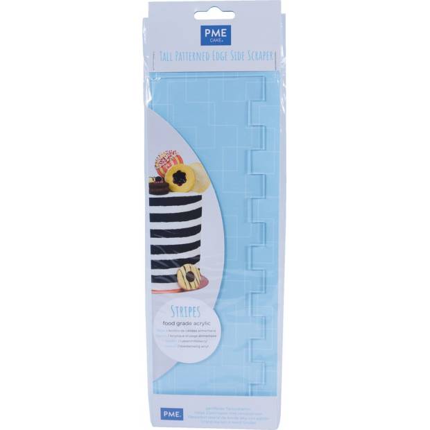 PME vysoké vzorované boční škrabky na okraji jsou praktický nástroj, který můžete použít k výrobě hladkého nebo pruhovaného máslového dortu. Lze použít dvě strany škrabky, jedna strana je hladká a druhá strana má pruhovaný vzor. Je možné ji také použít s čokoládovou nebo královskou polevou.