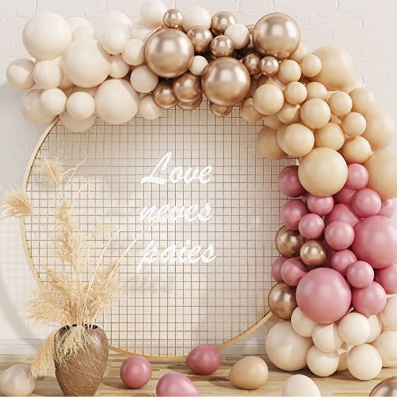 Krásná girlanda z balónků v béžovo-růžové kombinaci vytvoří vskutku slavnostní atmosféru. Tato dechberoucí girlanda vypadá krásně připevněná na stěně nad stolem jako hlavní dekorace vaší oslavy. Můžete ji přimontovat nad vchod a vytvořit tak velkolepou bránu. Tato elegantní a šik dekorace přitáhne pozornost a potěší všechny hosty. Ideální na svatbu, křest, narozeniny, první přijímání, výročí nebo jinou luxusní oslavu. Díky fenomenální balónkové výzdobě krásně zvýrazníte místo pro focení na památku. Nainstalujte pod girlandu barevně sladěný závěs. Na jeho pozadí položte kytici heliových balónků, připravte bar nebo sladký stůl. Dopřejte svým hostům nezapomenutelnou zábavu při pořizování šťastných fotografií z večírku.