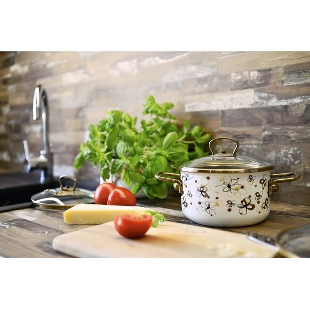 PREMIUM krémový – novinka v našem portfoliu prémiové řady smaltovaného nádobí.Jemný vzor květin přináší lehkost a úsměv a teplé krémové, hnědé a zlaté tóny zútulní interiér vaší kuchyně a poskytne jí střízlivost a solidní vzhled.Ať už máte tradiční, rustikální nebo moderní styl kuchyně, příprava pokrmů v našem nádobí vás bude vysloveně těšit!