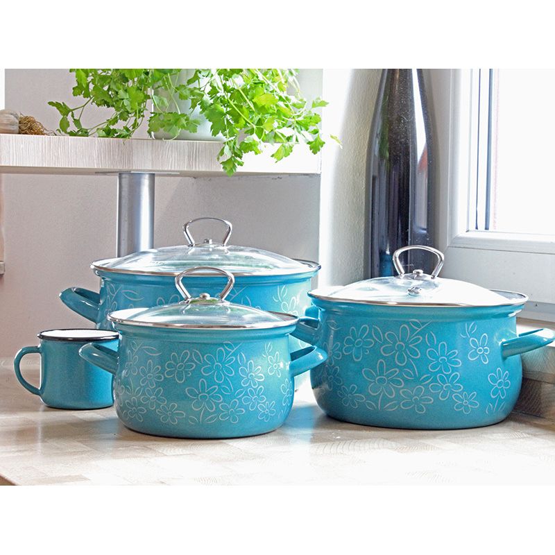 Nová řada smaltovaného nádobí FLOWER zaujme už na první pohled.A to především svým baněným tvarem a odvážným vzhledem, kterému dominuje netradiční tmavě akvamarínová barva v kombinaci s originálním reliéfovým květinovým vzorem s 3D efektem vytvářejícím dokonalou plasticitu.