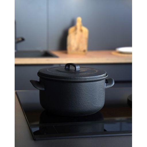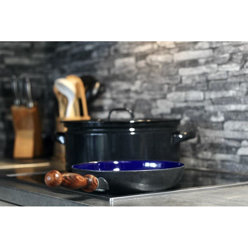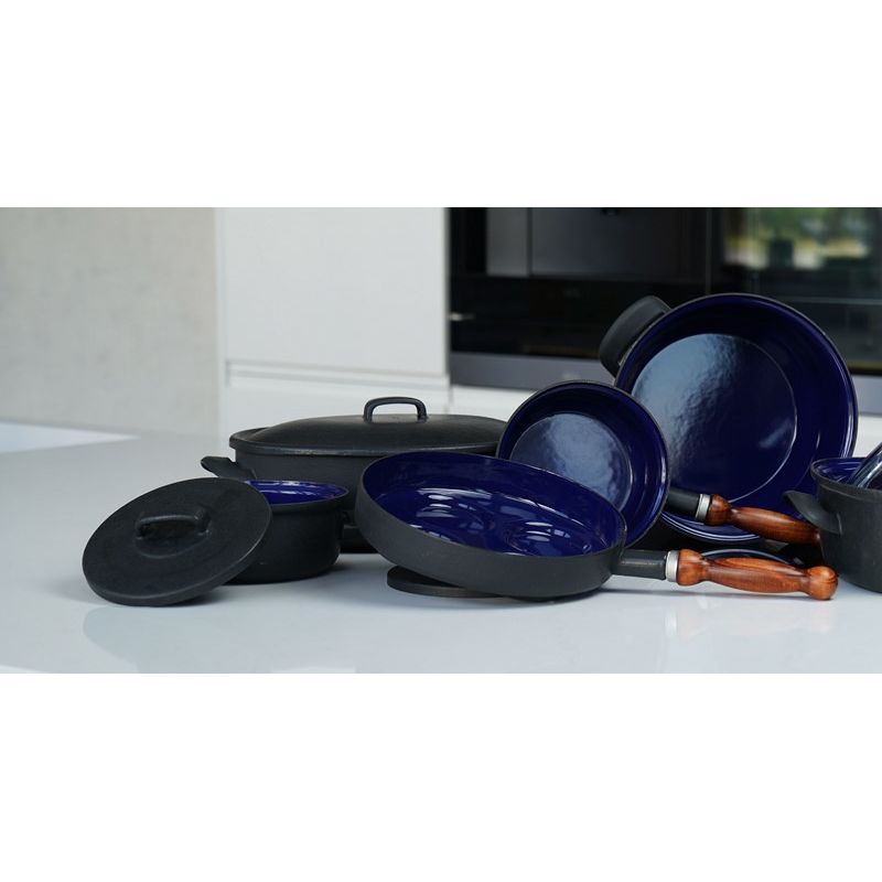 Zatímco na vnější straně nádobí dominuje minimalistickému vzhledu černý matný smalt, vnitřní stranu zdobí elegantní tmavě modrá barva.