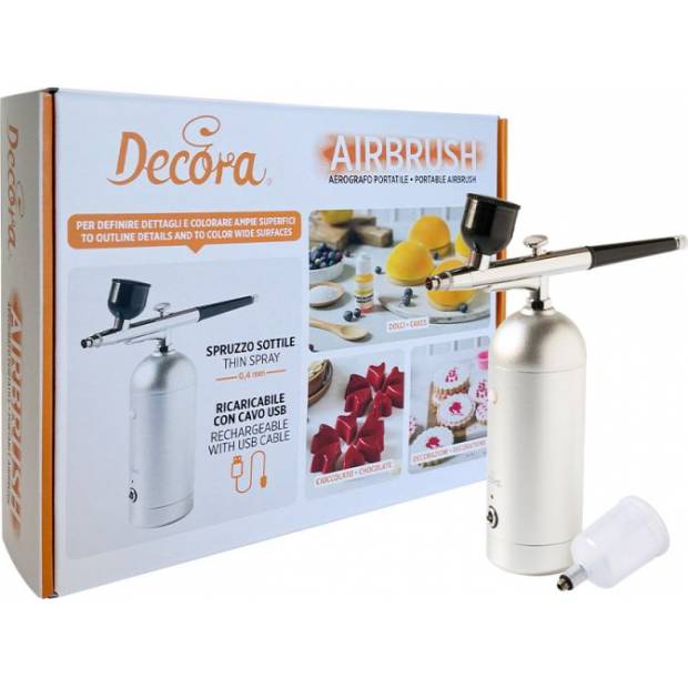 S tímto nástrojem budete moci dosáhnout realistických a detailních barevných přechodů: airbrush pistole je na horní straně vybavena pákou pro maximální kontrolu nad dekorací a snadno plnitelnou nádrží. Perfektní nejen pro zdobení dezertů, ale také pro hobby práce, manikúru a kutily pouze za použití vodou ředitelných barviv. Nabíjení pomocí USB kabelu, který je součástí sady, nebo z elektrické zásuvky pomocí adaptéru, který není součástí balení, nebo přes USB port.
