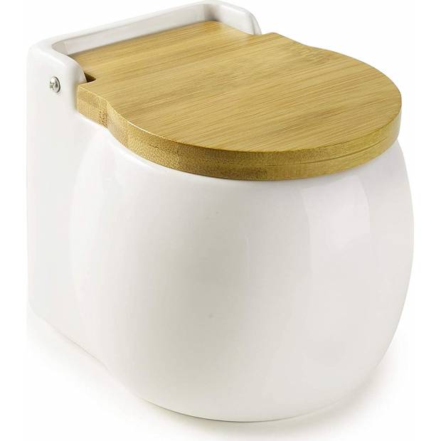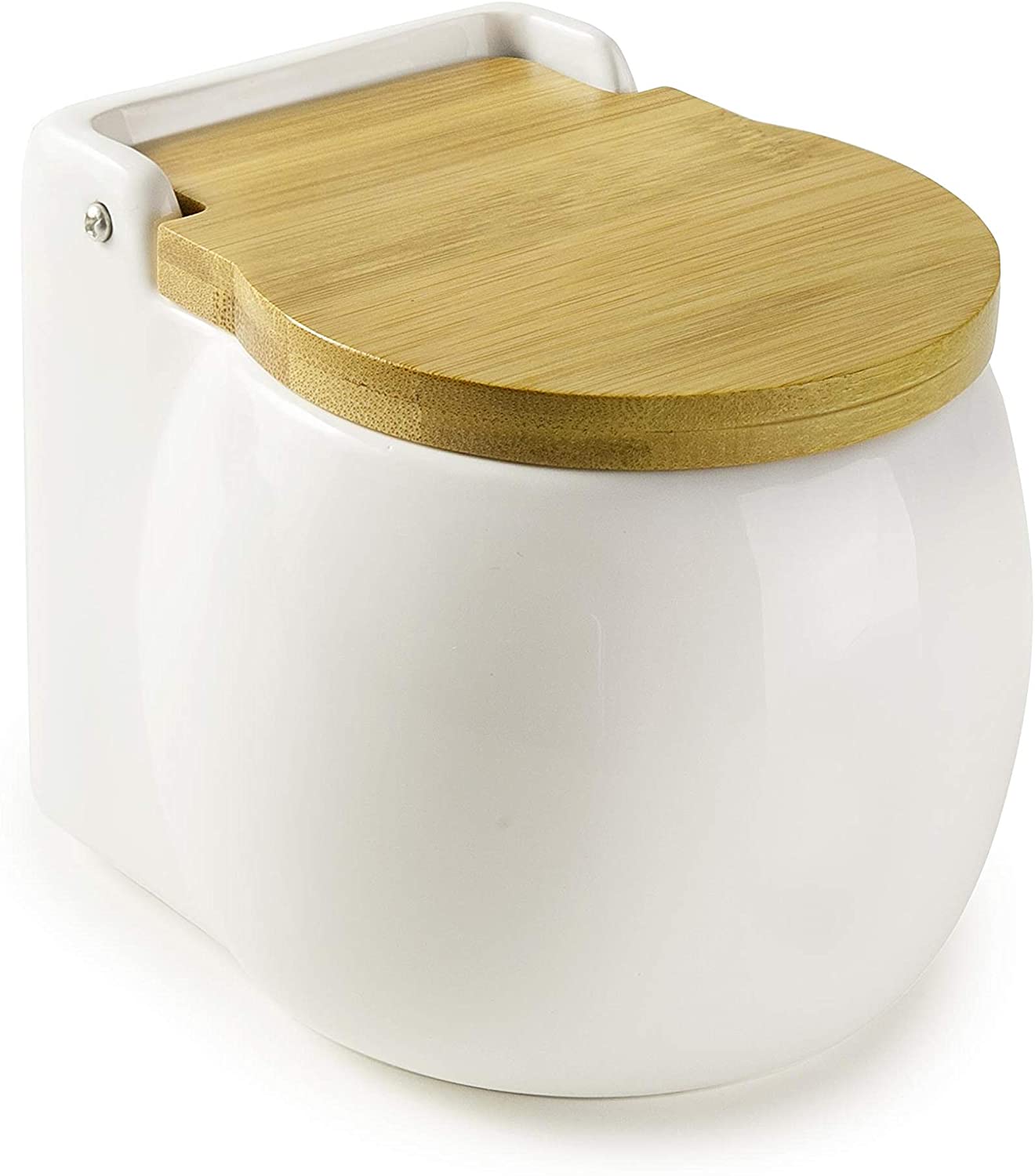 Keramická dóza na sůl s dřevěným víkem a lžičkou pro snadné dávkování.