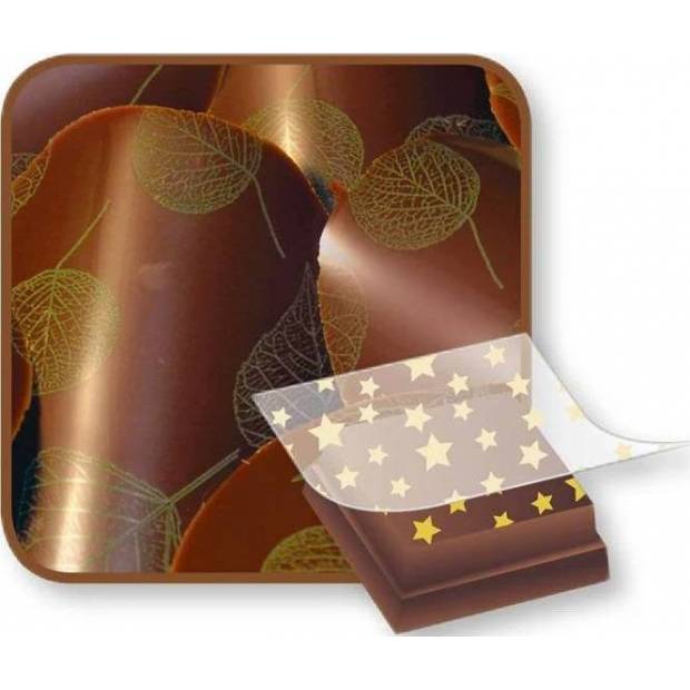 Rozměr: 36,5 x 25 cm (vzor cca 33,5 x 23 cm) Fólie na dekoraci čokolády k použití zejména na pralinky, obtisky na dorty s čokoládovou polevou a ostatní čokoládové výrobky