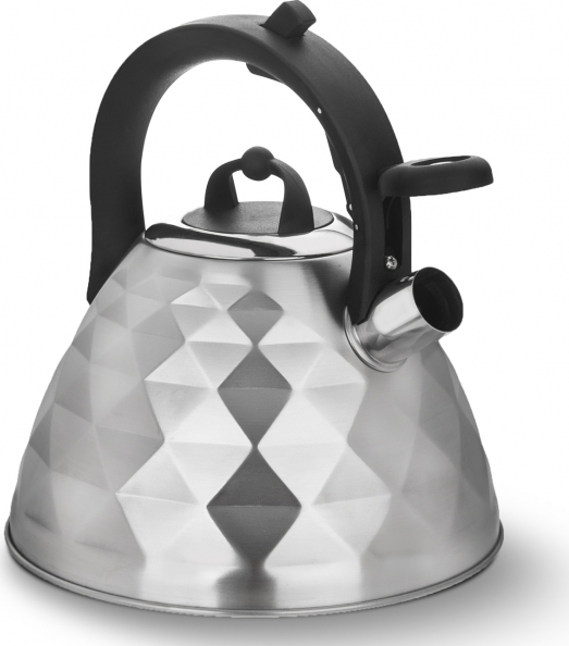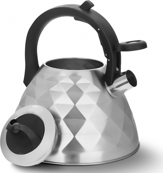 Luxusní nerezový čajník neobvyklého prolamovaného tvaru, s černými plastovými prvky, je opatřen odklápěcí píšťalkou, která ohlásí vařící se vodu