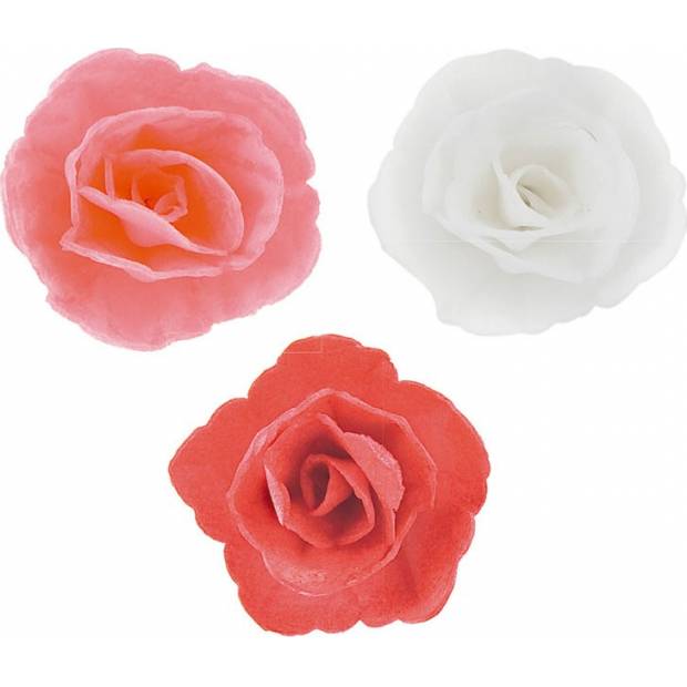 Jemné růže - červené, růžové a bílé. Průměr: 4,5 cm. Množství: 36 kusů. Použijte je jako nádhernou dekoraci na dort nebo rolády.