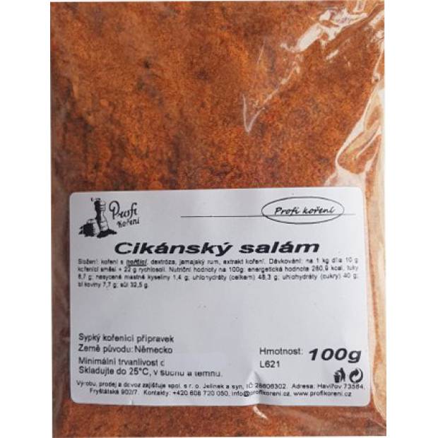 Mix koření pro ochucení salámů. Tato směs obsahuje hořčici. Složení: koření s hořčicí, dextróza, jamajský rum, extrakt koření. Dávkování: Na 1 kg masa přidejte 10 g směsi + 22 g rychlosoli