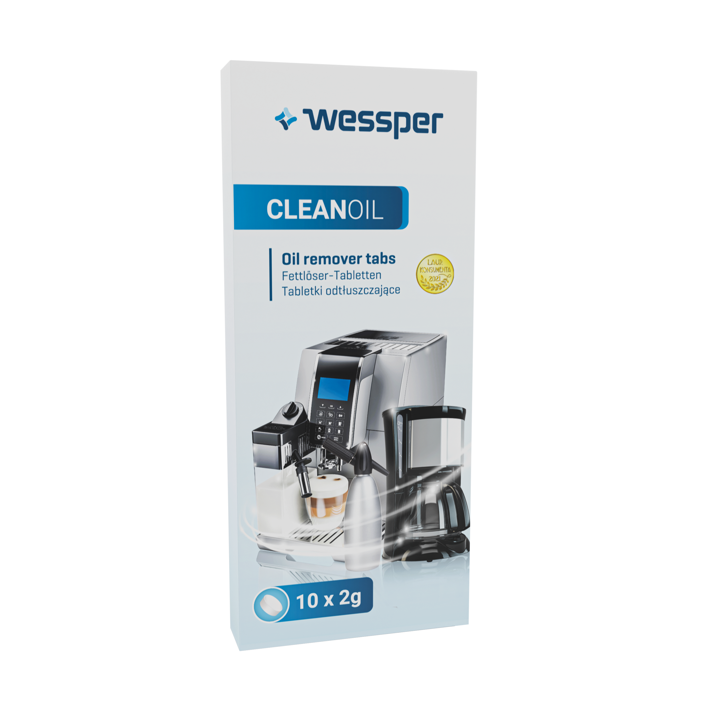 Pravidelné čištění prodlužuje životnost kávovaru a domácích spotřebičů. Aby kávovar fungoval správně po dlouhou dobu, měl by se čistit měsíčně nebo po přípravě 250 šálků kávy, aby se kávovar nezanášel zbytky kávy. Čištění / odmašťování stroje - Návod: Chcete-li dosáhnout nejlepšího čisticího/odmašťovacího účinku, vložte tabletu Wessper CleanOil do otvoru pro mletou kávu. Poté spusťte v přístroji speciální čisticí program pro stroje s touto funkcí (zkontrolujte kartu produktu) nebo spusťte program pro přípravu kávy (podrobný návod na obalu). Po dokončení procesu důkladně umyjte spařovací jednotku tekoucí vodou.