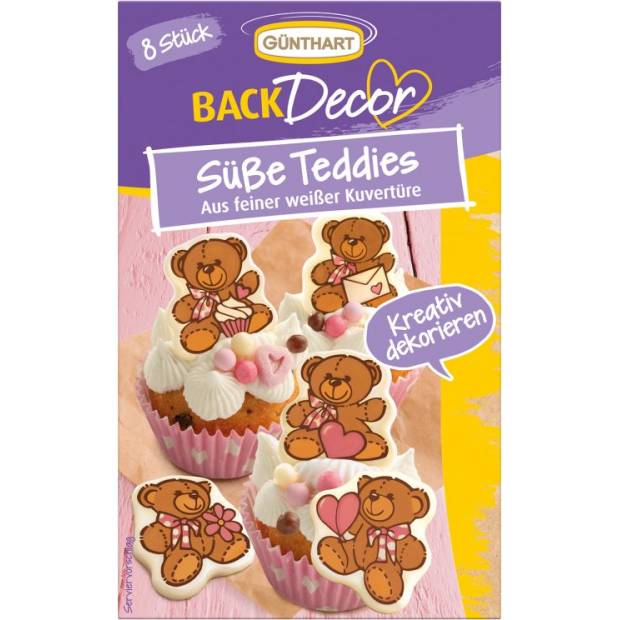 Dodejte svým pečicím výtvorům kouzelný a sladký nádech se sladkými medvídky Günthart BackDecor vyrobenými z té nejlepší bílé čokolády. Tato okouzlující sada obsahuje celkem 8 kusů v různých motivech.Tito milí medvídci vyrobeni z vysoce kvalitní bílé čokolády jsou nejen dekorativním, ale i lahodným doplňkem vašich sladkých výtvorů. Jemná čokoládová chuť potěší nejen děti, ale i dospělé.