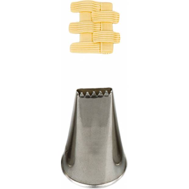 Kovová cukrářská zdobící špička plochá výpletová č. 47 pro snadné vytváření kreativních prvků z krému. Špičku můžete použít se zdobícím sáčkem opakovaně. Je vyrobená z nerezové oceli, na povrchu nezůstávají skvrny od tuku. Není vhodná pro mytí v myčce.