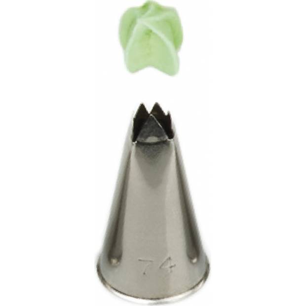 Kovová cukrářská zdobící špička 74 na listy, se kterou vytvoříte přesnou a jedinečnou výzdobu. Špičku můžete použít se zdobícím sáčkem opakovaně. Je vyrobená z nerezové oceli, na povrchu nezůstávají skvrny od tuku. Není vhodná pro mytí v myčce.