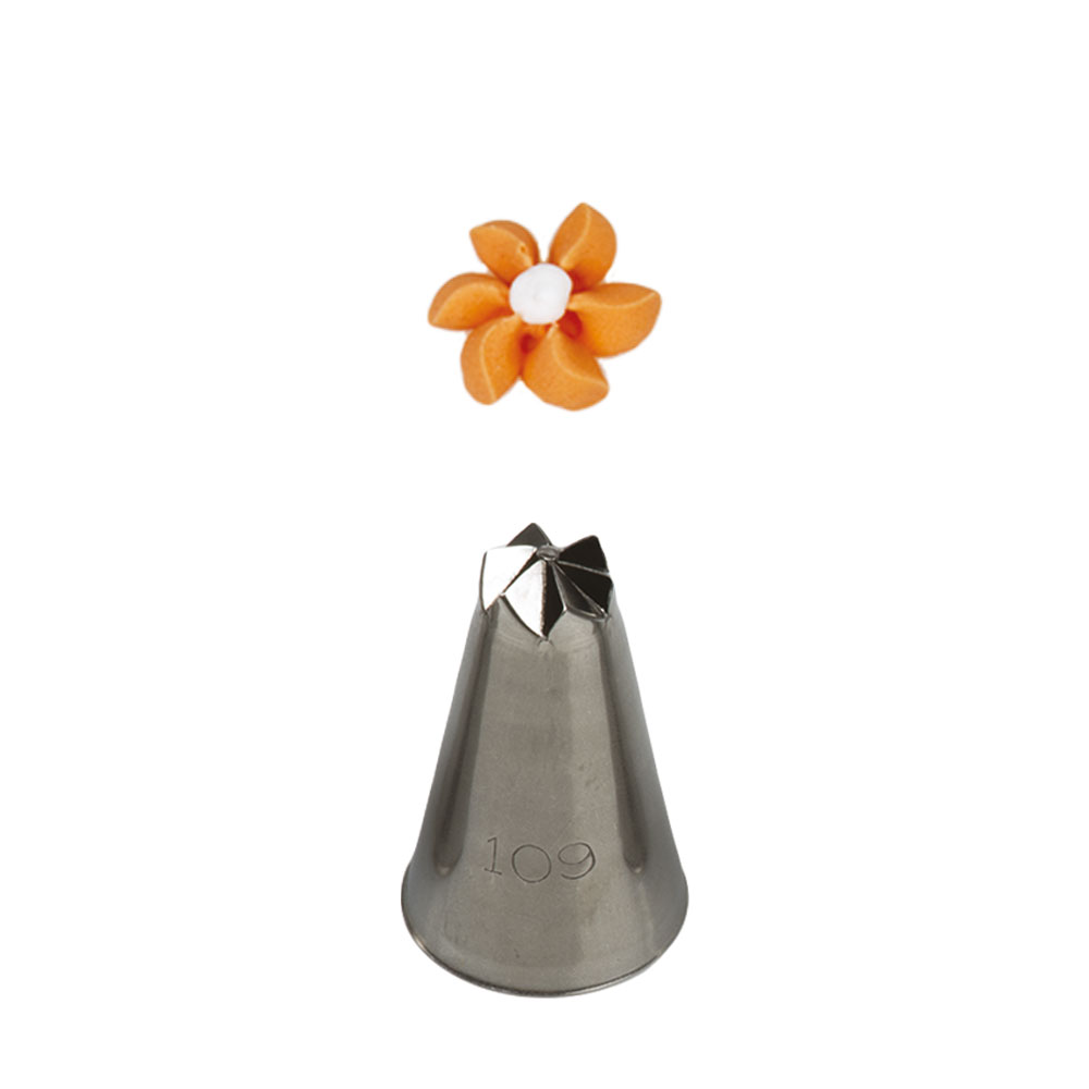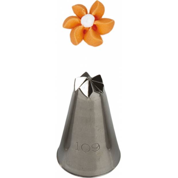 Kovová cukrářská zdobící špička řezaná 109, se kterou zaručeně vytvoříte velmi přesnou a jedinečnou výzdobu. Špičku můžete použít se zdobícím sáčkem opakovaně. Je vyrobená z nerezové oceli, na povrchu nezůstávají skvrny od tuku. Není vhodná pro mytí v myčce.