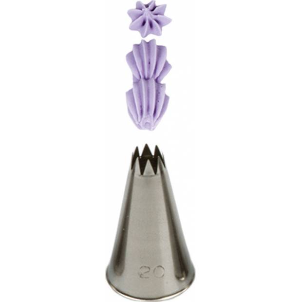 Kovová cukrářská zdobící špička řezaná 20 vám zaručí přesnou a jedinečnou výzdobu. Špičku můžete použít se zdobícím sáčkem opakovaně. Je vyrobená z nerezové oceli, na povrchu nezůstávají skvrny od tuku. Není vhodná pro mytí v myčce.