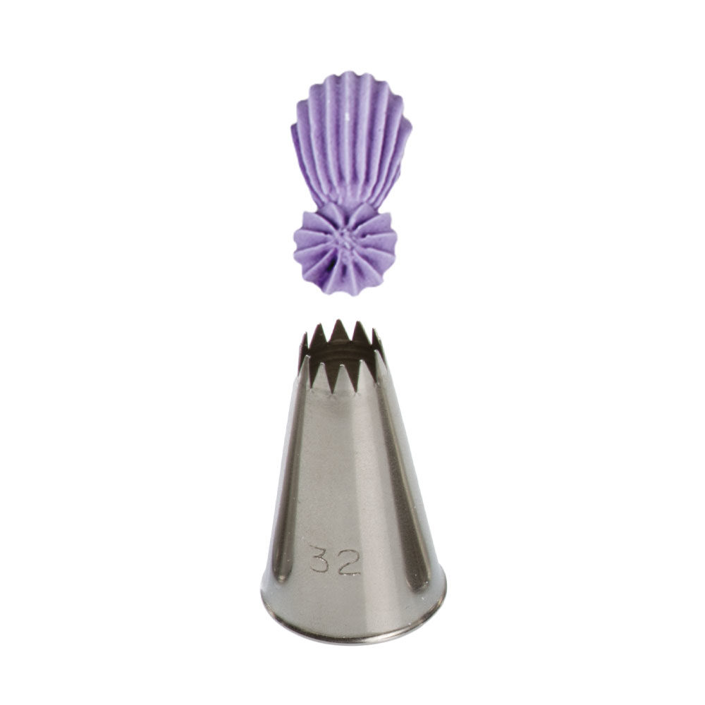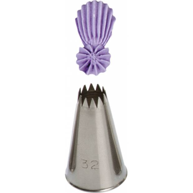 Kovová cukrářská zdobící špička řezaná 32, se kterou zaručeně vytvoříte velmi přesnou a jedinečnou výzdobu. Špičku můžete použít se zdobícím sáčkem opakovaně. Je vyrobená z nerezové oceli, na povrchu nezůstávají skvrny od tuku. Není vhodná pro mytí v myčce.