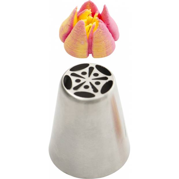 Kovová cukrářská zdobící špička ruská 17 tulipán vám zaručí přesnou a jedinečnou výzdobu. Špičku můžete použít se zdobícím sáčkem opakovaně. Je vyrobená z nerezové oceli, na povrchu nezůstávají skvrny od tuku. Není vhodná pro mytí v myčce.