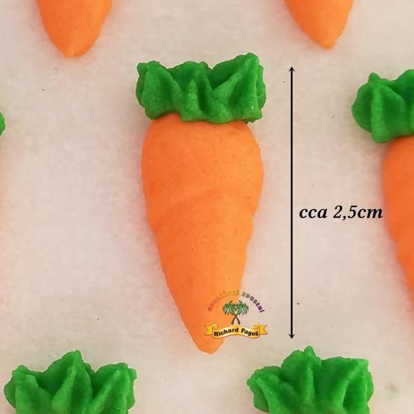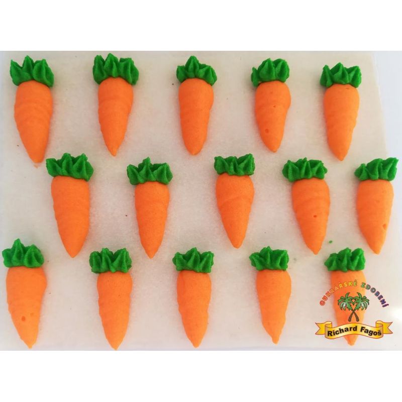 Cukrová dekorace ve tvaru mrkviček poslouží nejen k dekorování dortů, ale i rolád a dalších cukrářských a pekařských výtvorů. Ideální na ozdobu mrkvového dortu. Každá mrkev má v průměru 2,5 cm.