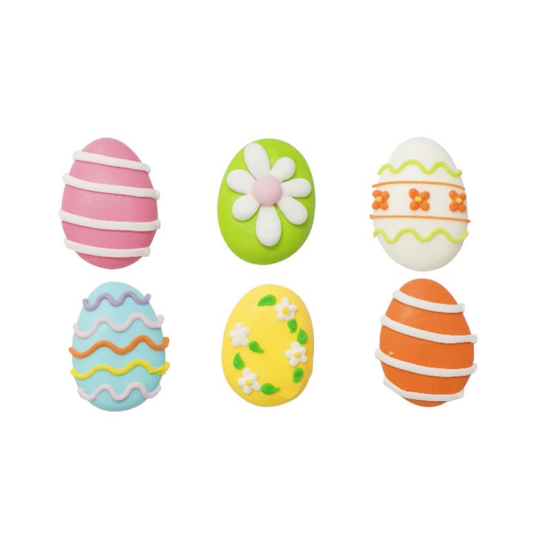 Připravte si dokonalé velikonoční dezerty. Zde je 6 malých cukrových vajíček (růžová, zelená, žlutá, modrá, bílá a oranžová) s různými malými vzory, které dodají vašemu pečivu finální šmrnc!