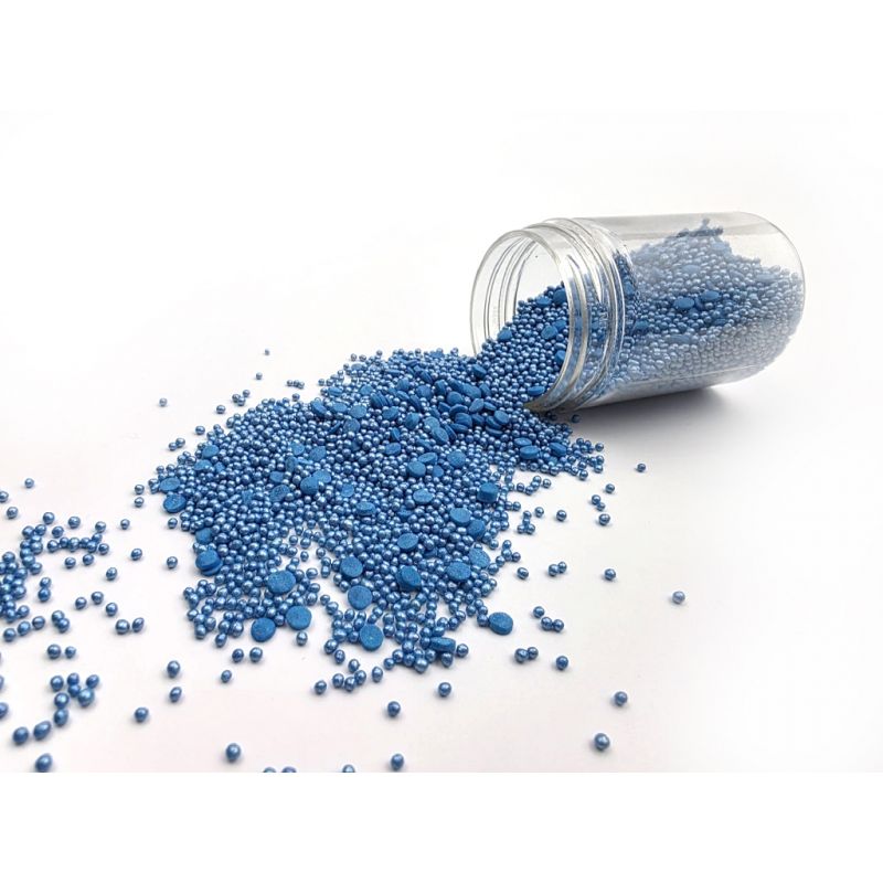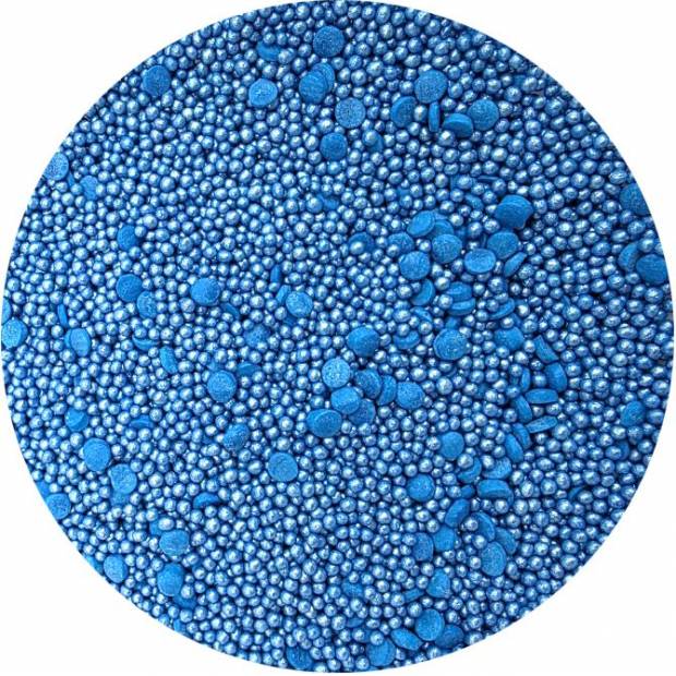 Univerzální, barevné a chutné. Mix se skládá z modrých konfet a perliček v metalickém provedení. Tento typ posypu je prostě dokonalý. Jejich barvy vyniknou stejně jako jejich tvary. Celá sestava však nepůsobí honosně, ale spíše velmi uceleně. Navzdory rozmanitosti můžete všechny její prvky snadno použít při zdobení jediného dortu. Sypání se používá ke zdobení různých sladkých pečiv. Mohou to být dorty, zákusky, cupcaky nebo zmrzlinové dezerty, stejně jako dorty, perníčky nebo jiné sušenky. Konfety z cukru mají mnoho výhod jako je neuvěřitelně snadné použití. Stačí je položit na vámi vybraný pečený výrobek. Krásná a jedinečná dekorace hotová během pár chvil a vyrobená v pohodlí domova. Hodí se pro nejrůznější příležitosti. Nemění chuť vašich výtvorů. Pokud zdobení nasypete na vláčný krém, vlhkost z něj může posypek změkčit. Ale pozor, pokud bude zdobení na vlhkém krému delší dobu, může se z posypku uvolnit i barvivo a to na povrch krému. Pokud chcete, aby větší části dekorace drželi například na potahovém dortu, můžete tento druh zdobení k dortům lepit polotuhou čokoládou, nebo glazurou na perníčky. s posypky pracujte nejlépe nad miskou, či plechem s okrajem.