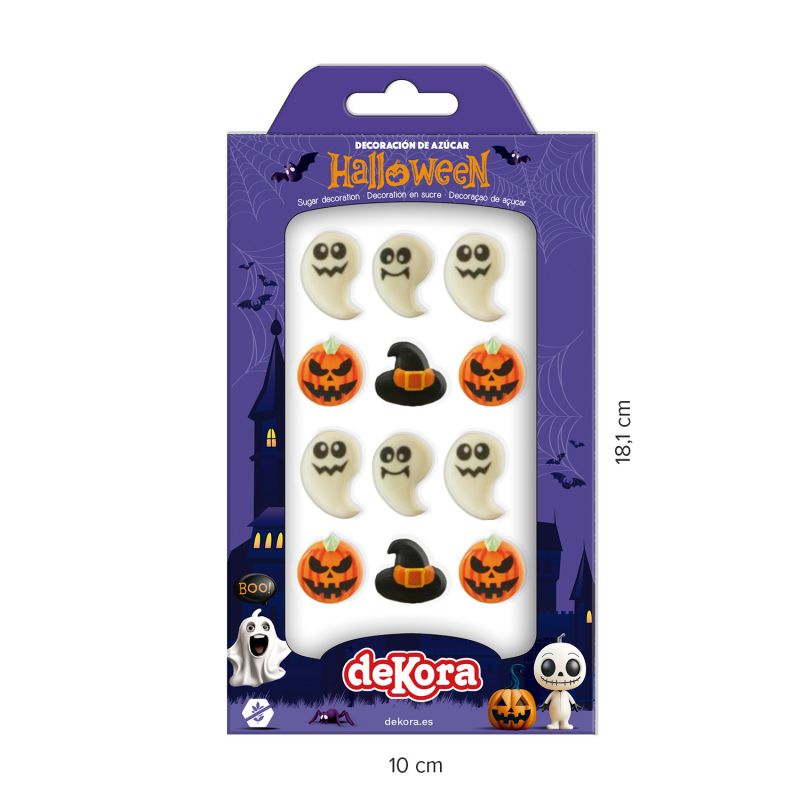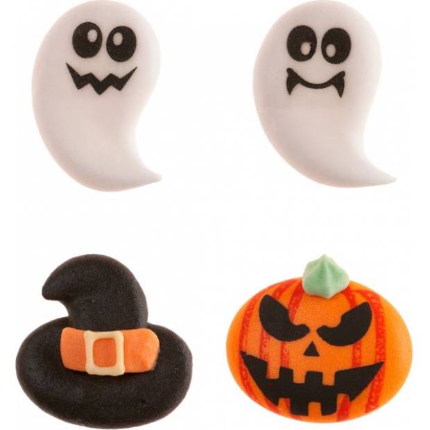 Objevte naše cukrové figurky na pečení, speciálně navržené k ozdobení cupcakes, dortů, sušenek a dezertních stolů během těchto svátků. Dýně, duchové a mnoho dalšího, vyrobené tak, aby vašim výtvorům dodaly zábavný, barevný a lahodný nádech. S těmito strašidelnými cukrovými dekoracemi od Dekory je teď opravdový Halloween. Sada obsahuje 4 různé, detailní halloweenské postavičky, které můžete použít k ozdobení dortů, muffinů a sušenek.