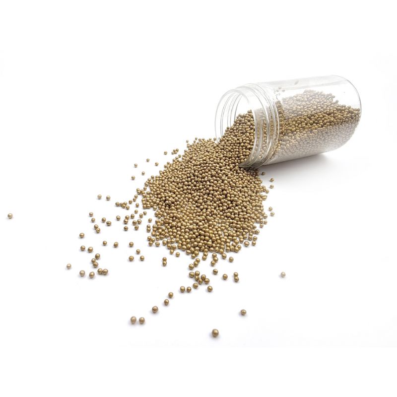 Zlaté metalické cukrové perličky jsou krásným doplňkem hladkého povrchu dortů. Dají se s nimi zdobit i perníčky, drobné cukroví, muffiny nebo dorty. Jedná se o univerzální dekorace, které vám pomohou doladit vaše chutné pečivo. Další obrovskou výhodou perel je jejich snadná aplikace. Stačí je položit na vámi vybraný povrch a je hotovo. Perly se perfektně hodí k cukrové pastě a dalším. Lze je kombinovat s různými krémy. V naší nabídce najdete jemné cukrové perly, které lze bez obav konzumovat i s dezertem. Pokud zdobení nasypete na vláčný krém, vlhkost z něj může posypek změkčit. Ale pozor, pokud bude zdobení na vlhkém krému delší dobu, může se z posypku uvolnit i barvivo a to na povrch krému. Pokud chcete, aby větší části dekorace drželi například na potahovém dortu, můžete tento druh zdobení k dortům lepit polotuhou čokoládou, nebo glazurou na perníčky. s posypky pracujte nejlépe nad miskou, či plechem s okrajem.