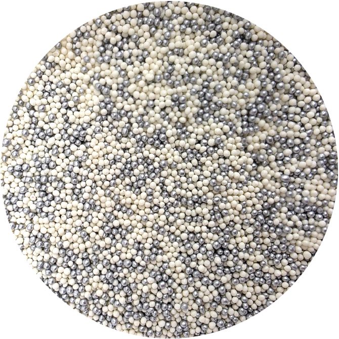 Stříbrno-bílé perličky jsou univerzální cukrová dekorace. Tyto barevné cukrové kuličky dodávají eleganci tradičním i inovativním cukrářským výtvorům. Vysoce kvalitní barviva zaručují barevnou stálost. Perličky na zdobení dortů jsou krásným doplňkem hladkého povrchu dortů. Dají se s nimi zdobit i perníčky, drobné cukroví, muffiny nebo dorty. Jedná se o univerzální dekorace, které vám pomohou doladit vaše chutné pečivo. Další obrovskou výhodou perel je jejich snadná aplikace. Stačí je položit na vámi vybraný povrch a je hotovo. Perly se perfektně hodí k cukrové pastě a dalším. Lze je kombinovat s různými krémy. V naší nabídce najdete jemné cukrové perly, které lze bez obav konzumovat i s dezertem. Pokud zdobení nasypete na vláčný krém, vlhkost z něj může posypek změkčit. Ale pozor, pokud bude zdobení na vlhkém krému delší dobu, může se z posypku uvolnit i barvivo a to na povrch krému. Pokud chcete, aby větší části dekorace drželi například na potahovém dortu, můžete tento druh zdobení k dortům lepit polotuhou čokoládou, nebo glazurou na perníčky. s posypky pracujte nejlépe nad miskou, či plechem s okrajem.