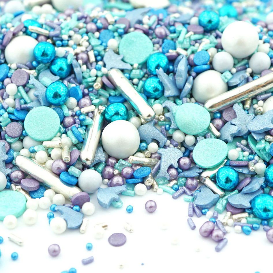 Ponořte se do úžasného křupavého podvodního světa delfínů, mušlí a mořských modrých cukrových posypů. Směs mořského hluku je dokonalým společníkem při pečení, pokud uvažujete o příští párty s mořskou pannou, narozeniny delfínů nebo zahajovací dort pro sezónu venkovního bazénu. Kromě modrých mini delfínů a bílých, velkých drobivých mušlí, spousta malých modrých konfet dovádí v malých i velkých a spousta bublinek vyrobených z bílých drobivých perel a nepareilů K tomu zářivě modré mini křupavé kuličky, velké bílé jemné čokoládové kuličky a stříbrné cukrové tyčinky.