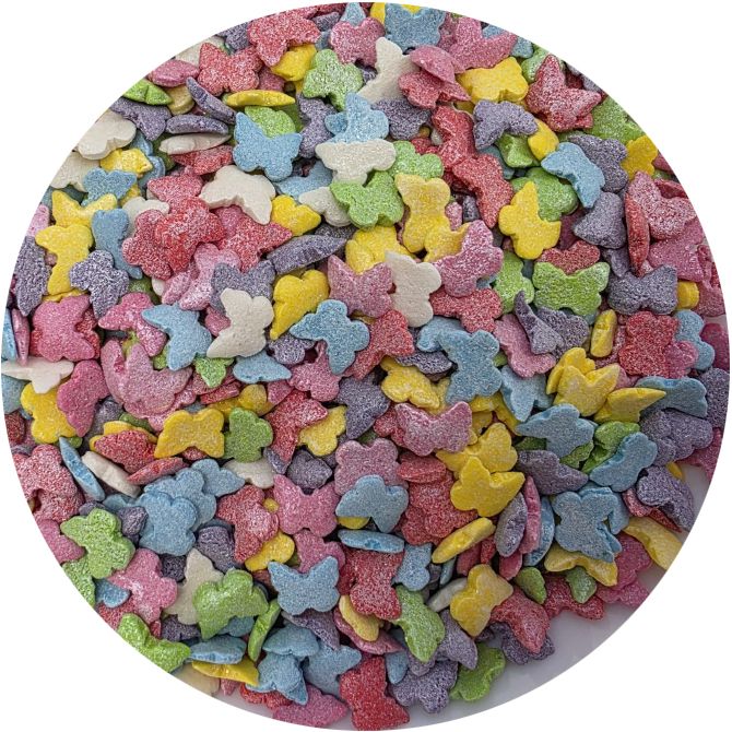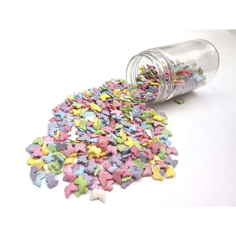 Sypání má podobu barevných motýlků. Jedná se o sladký posyp z řady unikátních produktů od ILOVECAKES. Nemění chuť zdobených výrobků, je vyroben z přírodních barviv a má chuť cukrové pasty. Jedná se o velmi univerzální zdobení, ideální na dekorování cupcaků, sušenek, perníčků, muffinů, dortů, zákusků, pečiva, dortů, pralinek, lanýžů, čokolády, zmrzliny a mnoha dalších sladkých výrobků, zejména těch s krémy a polevou. Je vhodný pro každou příležitost: svatba, karneval, narozeniny, Den matek a mnoho dalších. Baleno v praktické šroubovací dóze.Pokud zdobení nasypete na vláčný krém, vlhkost z něj může posypek změkčit. Ale pozor, pokud bude zdobení na vlhkém krému delší dobu, může se z posypku uvolnit i barvivo a to na povrch krému. Pokud chcete, aby větší části dekorace drželi například na potahovém dortu, můžete tento druh zdobení k dortům lepit polotuhou čokoládou, nebo glazurou na perníčky. s posypky pracujte nejlépe nad miskou, či plechem s okrajem.