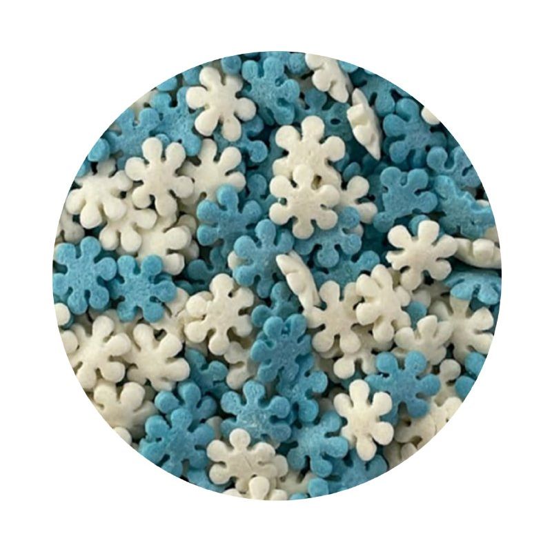 Cukrové posypky v podobě modro-bílých sněhových vloček jsou perfektní ozdobou dortů, koláčů a dalšího pečiva. Vločky dodají kouzlo a romantickou atmosféru každé kompozici dezertu. Díky nim můžete vyjádřit krásu jedinečným a vkusným způsobem. Tyto dekorativní prvky jsou perfektní pro zdobení dortů k různým příležitostem, jako jsou narozeniny, Vánoce, ale i zásnuby nebo výročí, dodávají jim jedinečné kouzlo a eleganci.Pokud zdobení nasypete na vláčný krém, vlhkost z něj může posypek změkčit. Ale pozor, pokud bude zdobení na vlhkém krému delší dobu, může se z posypku uvolnit i barvivo a to na povrch krému. Pokud chcete, aby větší části dekorace drželi například na potahovém dortu, můžete tento druh zdobení k dortům lepit polotuhou čokoládou, nebo glazurou na perníčky. s posypky pracujte nejlépe nad miskou, či plechem s okrajem.