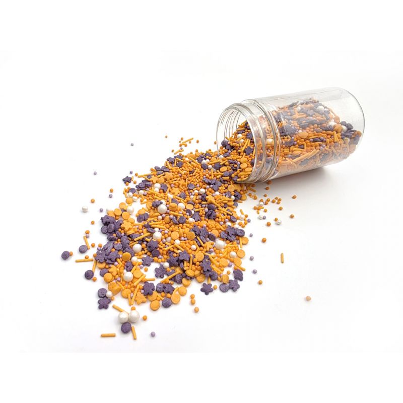 Na Halloween můžete připravit pohoštění, zákusky a dorty zdobené tímto perfektním tématickým sypáním. Posypky na dorty, sušenky a dezerty v různých tvarech a texturách v odstínech oranžové, stříbrné, bílé a černé. Lesklé perly, posypky, konfety dodávají kouzlo dortům, cupcakes, sušenkám, muffinům a dalšímu pečenému zboží. Takto zdobené dezerty vzbudí obdiv vašich hostů a potěší nejen ty nejmenší. Pokud zdobení nasypete na vláčný krém, vlhkost z něj může posypek změkčit. Ale pozor, pokud bude zdobení na vlhkém krému delší dobu, může se z posypku uvolnit i barvivo a to na povrch krému. Pokud chcete, aby větší části dekorace drželi například na potahovém dortu, můžete tento druh zdobení k dortům lepit polotuhou čokoládou, nebo glazurou na perníčky. s posypky pracujte nejlépe nad miskou, či plechem s okrajem.