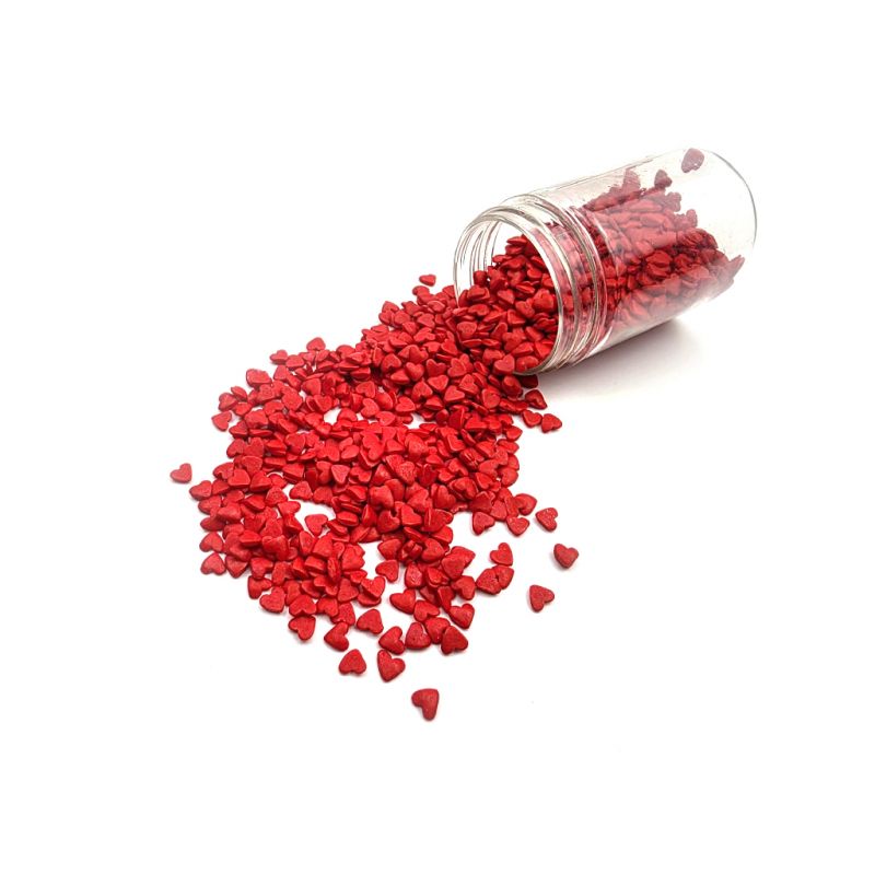 Červená srdíčka pro zdobení dortů, koláčků, sušenek. Krásné dekorace pro vaše pečivo. Na hotové pečivo stačí nasypat nebo naaranžovat do požadovaného tvaru a je to. Jsou ideální na valentýnské překvapení nebo jinou oslavu. Červená barva bude na pečivu vypadat krásně. Upečte si perníčky, cupcaky nebo jiné pečivo a bavte se s dětmi jejich zdobením. Pokud zdobení nasypete na vláčný krém, vlhkost z něj může posypek změkčit. Ale pozor, pokud bude zdobení na vlhkém krému delší dobu, může se z posypku uvolnit i barvivo a to na povrch krému. Pokud chcete, aby větší části dekorace drželi například na potahovém dortu, můžete tento druh zdobení k dortům lepit polotuhou čokoládou, nebo glazurou na perníčky. s posypky pracujte nejlépe nad miskou, či plechem s okrajem.