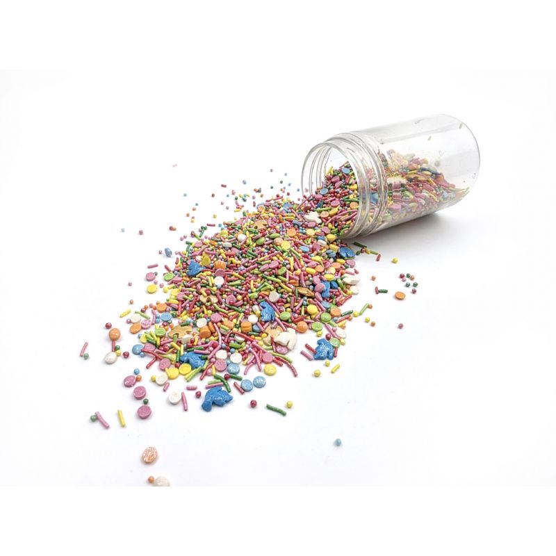 Směs obsahuje zlaté a bílé holubičky a celou řadu dalších prvků, které dohromady vytváří jedinečné zdobení na vaše dorty a zákusky. Toto je perfektní doplněk k vašim dortům, cupcakes a sušenkám. Zkombinujte s našimi dalšími párty potřebami pro skutečně jedinečnou událost. Tyto barevné prvky jsou jemné, okouzlující a krásně kontrastují se světlou smetanou nebo tmavou čokoládou, čímž dodávají pečeným výrobkům jedinečný vzhled. Proměnit jednoduchý dezert v sofistikovanou cukrářskou dekoraci trvá jen pár okamžiků. Cukrové zdobení Perfektní večírek přináší na vaše cukrářské výtvory záplavu barev. Směs obsahuje cukrové konfety, srdíčka a tyčinky. Díky svému okouzlujícímu vzhledu ve tvaru srdíček a malých koleček se tato posypka stane ozdobou nejen dortů, ale i cupcaků, dortů, zmrzliny a dalších sladkostí. Tyto barevné prvky jsou jemné, okouzlující a krásně kontrastují se světlou smetanou nebo tmavou čokoládou, čímž dodávají pečeným výrobkům jedinečný vzhled. Proměnit jednoduchý dezert v sofistikovanou cukrářskou dekoraci trvá jen pár okamžiků. Pokud zdobení nasypete na vláčný krém, vlhkost z něj může posypek změkčit. Ale pozor, pokud bude zdobení na vlhkém krému delší dobu, může se z posypku uvolnit i barvivo a to na povrch krému. Pokud chcete, aby větší části dekorace drželi například na potahovém dortu, můžete tento druh zdobení k dortům lepit polotuhou čokoládou, nebo glazurou na perníčky. s posypky pracujte nejlépe nad miskou, či plechem s okrajem.
