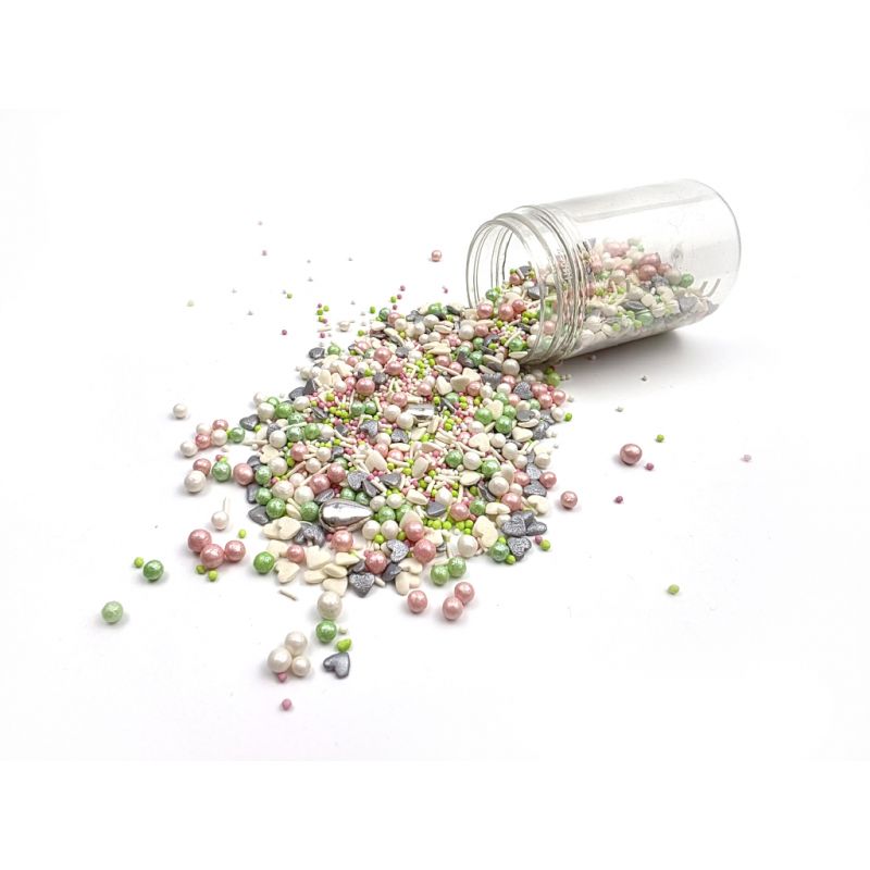 Směs zelených, bílých a růžových posypek různých tvarů je skvělou ozdobou vašeho lahodného dortu. Každý pečený výrobek vypadá skvěle s těmito jedlými perlami. Stačí posypat hotový výrobek nebo naaranžovat požadované ozdoby a máte hotovo. Ideální pro zdobení dortů, cupcakes, pečiva. Využijte tento elegantní mix připravený k dekoraci. Posypky budou krásně vypadat na dortících nebo jiném pečivu.Ideální pro různé příležitosti, např. oslava narození dítěte, narozeniny, jmeniny, svatby, přijímání, křtiny, rozlučky se svobodou, svátky. Pokud zdobení nasypete na vláčný krém, vlhkost z něj může posypek změkčit. Ale pozor, pokud bude zdobení na vlhkém krému delší dobu, může se z posypku uvolnit i barvivo a to na povrch krému. Pokud chcete, aby větší části dekorace drželi například na potahovém dortu, můžete tento druh zdobení k dortům lepit polotuhou čokoládou, nebo glazurou na perníčky. s posypky pracujte nejlépe nad miskou, či plechem s okrajem.