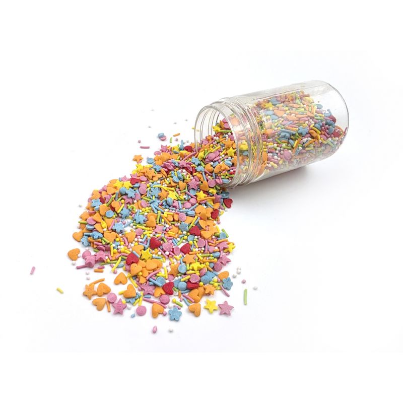 Vydejte se s tímto barevným cukrovým sypáním do vírů karnevalu. Krásné cukrové posypky I LOVE CAKES v různých tvarech vám pomohou zajímavým způsobem ozdobit muffiny, dorty, koláče, dezerty, cake pops, sušenky a další sladkosti. Posypky budou krásnou ozdobou pečiva na nejrůznější párty, výročí nebo na dort k narozeninám. Cukrové posypky se budou hodit při přípravě sladkostí na sladký stůl. Cukrové posypky jsou baleny v praktické nádobě pro snadné dávkování a skladování. Skladujte na chladném a suchém místě mimo dosah slunečního záření.Pokud zdobení nasypete na vláčný krém, vlhkost z něj může posypek změkčit. Ale pozor, pokud bude zdobení na vlhkém krému delší dobu, může se z posypku uvolnit i barvivo a to na povrch krému. Pokud chcete, aby větší části dekorace drželi například na potahovém dortu, můžete tento druh zdobení k dortům lepit polotuhou čokoládou, nebo glazurou na perníčky. s posypky pracujte nejlépe nad miskou, či plechem s okrajem.