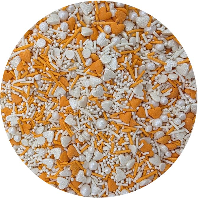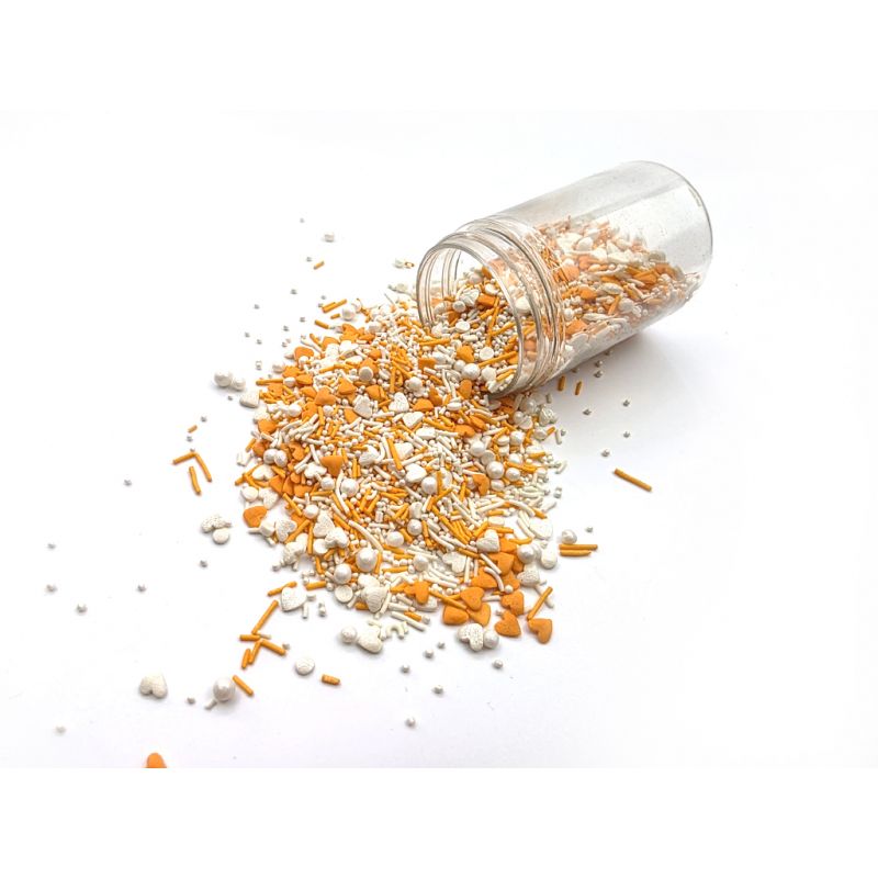 Oranžovo - bílý mix perliček, cukrových tyčinek a bílého máčku, který oceníte jako doplněk valentýnských dezertů, dortíků na babyshower, pro párty ve stylu Barbie, Halloween, apod. I LOVE CAKES v různých tvarech vám pomohou zajímavým způsobem ozdobit muffiny, dorty, koláče, dezerty, cake pops, sušenky a další sladkosti. Posypky budou krásnou ozdobou pečiva na nejrůznější párty, výročí nebo na dort k narozeninám. Cukrové posypky se budou hodit při přípravě sladkostí na sladký stůl. Posypky jsou baleny v praktické nádobě pro snadné dávkování a skladování. Skladujte na chladném a suchém místě mimo dosah slunečního záření.Pokud zdobení nasypete na vláčný krém, vlhkost z něj může posypek změkčit. Ale pozor, pokud bude zdobení na vlhkém krému delší dobu, může se z posypku uvolnit i barvivo a to na povrch krému. Pokud chcete, aby větší části dekorace drželi například na potahovém dortu, můžete tento druh zdobení k dortům lepit polotuhou čokoládou, nebo glazurou na perníčky. S posypkami pracujte nejlépe nad miskou, či plechem s okrajem."""