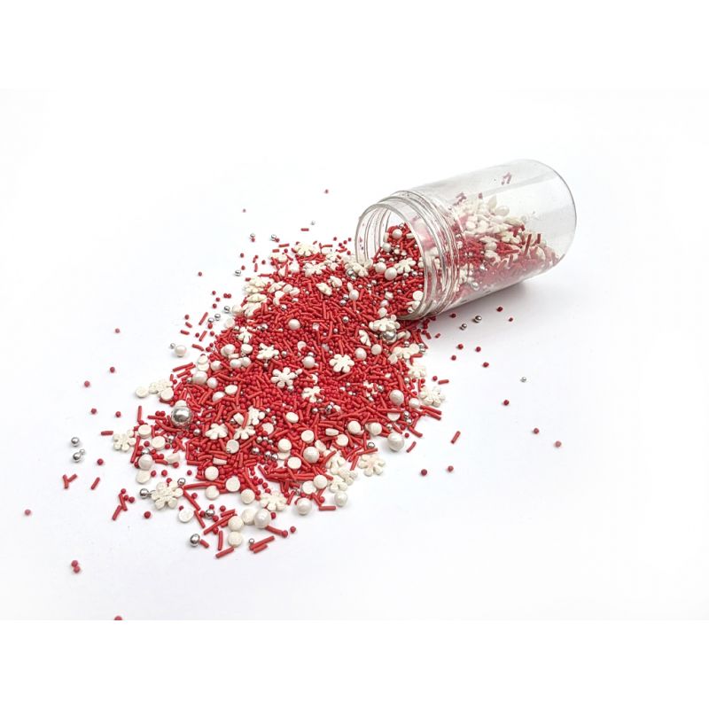 Sypání má podobu mixu sestaveného z různě velkých perliček a vánočních motivů. Jedná se o sladký posyp z řady unikátních produktů od ILOVECAKES. Nemění chuť zdobených výrobků, je vyroben z přírodních barviv a má chuť cukrové pasty. Jedná se o velmi univerzální zdobení, ideální na dekorování cupcaků, sušenek, perníčků, muffinů, dortů, zákusků, pečiva, dortů, pralinek, lanýžů, čokolády, zmrzliny a mnoha dalších sladkých výrobků, zejména těch s krémy a polevou. Je vhodný pro každou příležitost: zejména pro vánoční dorty a cukroví. Baleno v praktické šroubovací dóze. Pokud zdobení nasypete na vláčný krém, vlhkost z něj může posypek změkčit. Ale pozor, pokud bude zdobení na vlhkém krému delší dobu, může se z posypku uvolnit i barvivo a to na povrch krému. Pokud chcete, aby větší části dekorace drželi například na potahovém dortu, můžete tento druh zdobení k dortům lepit polotuhou čokoládou, nebo glazurou na perníčky. s posypky pracujte nejlépe nad miskou, či plechem s okrajem.