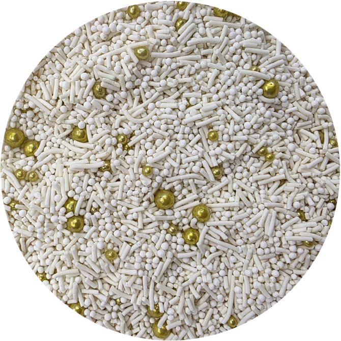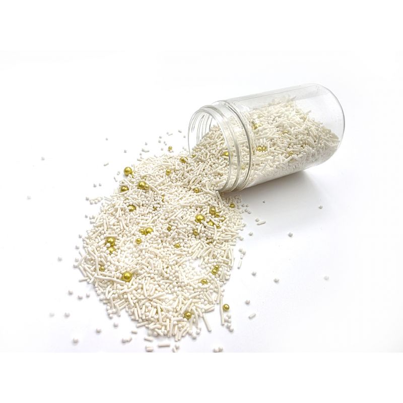 Svatební rej to je mix bílých tyčinek a zlatých perliček, které můžete použít na zdobení svatebních dortů, dezertů, cupcakes, pops cake lízátek a dalších dezertů na svatební hostinu. Jedinečné prvky udělají z každého dezertu středem pozornosti. Jsou považovány za hlavní dekorativní prvky mnoha pečiva a dalších dezertů. Jsou okouzlující a decentní na pohled a zároveň dělají obrovský dojem. Mají tvrdou strukturu a nerozpouštějí se ve zmrzlině ani ve šlehačce. Posypky jsou baleny v praktické nádobě pro snadné dávkování a skladování. Skladujte na chladném a suchém místě mimo dosah slunečního záření. Pokud zdobení nasypete na vláčný krém, vlhkost z něj může posypek změkčit. Ale pozor, pokud bude zdobení na vlhkém krému delší dobu, může se z posypku uvolnit i barvivo a to na povrch krému. Pokud chcete, aby větší části dekorace drželi například na potahovém dortu, můžete tento druh zdobení k dortům lepit polotuhou čokoládou, nebo glazurou na perníčky. s posypky pracujte nejlépe nad miskou, či plechem s okrajem.