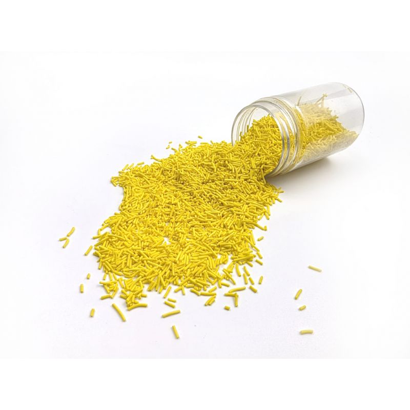 Cukrové tyčinky žluté dělají dorty, sušenky, cupcaky, perníčky, dortíky a zmrzlinu ze sušenek velmi elegantní. Dodávají dezertům dokonalý vzhled. Hodí se na každou příležitost. Od této chvíle je zdobení cupcaků a dortů ještě jednodušší! Používají je také profesionální cukráři k dozdobení dortů a jiného pečiva. Máme je v různých barvách, velikostech a tvarech. Díky tomu je lze snadno sladit s dalšími detaily na pečivu nebo dezertech. Pokud zdobení nasypete na vláčný krém, vlhkost z něj může posypek změkčit. Ale pozor, pokud bude zdobení na vlhkém krému delší dobu, může se z posypku uvolnit i barvivo a to na povrch krému. Pokud chcete, aby větší části dekorace drželi například na potahovém dortu, můžete tento druh zdobení k dortům lepit polotuhou čokoládou, nebo glazurou na perníčky. s posypky pracujte nejlépe nad miskou, či plechem s okrajem. Pokud zdobení nasypete na vláčný krém, vlhkost z něj může posypek změkčit. Ale pozor, pokud bude zdobení na vlhkém krému delší dobu, může se z posypku uvolnit i barvivo a to na povrch krému. Pokud chcete, aby větší části dekorace drželi například na potahovém dortu, můžete tento druh zdobení k dortům lepit polotuhou čokoládou, nebo glazurou na perníčky. s posypky pracujte nejlépe nad miskou, či plechem s okrajem.