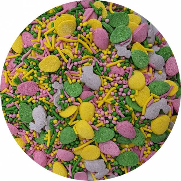Sypání má podobu velikonočních motivů. Najdete v něm velikonoční vajíčka, zajíčky, máček i cukrové tyčinky. Jedná se o sladký posyp z řady unikátních produktů od ILOVECAKES. Nemění chuť zdobených výrobků, je vyroben z přírodních barviv a má chuť cukrové pasty. Jedná se o velmi univerzální zdobení, ideální na dekorování cupcaků, sušenek, perníčků, muffinů, dortů, zákusků, pečiva, dortů, pralinek, lanýžů, čokolády, zmrzliny a mnoha dalších sladkých výrobků, zejména těch s krémy a polevou. Je vhodný pro každou příležitost: svatba, karneval, narozeniny, Den matek a mnoho dalších. Baleno v praktické šroubovací dóze. Pokud zdobení nasypete na vláčný krém, vlhkost z něj může posypek změkčit. Ale pozor, pokud bude zdobení na vlhkém krému delší dobu, může se z posypku uvolnit i barvivo a to na povrch krému. Pokud chcete, aby větší části dekorace drželi například na potahovém dortu, můžete tento druh zdobení k dortům lepit polotuhou čokoládou, nebo glazurou na perníčky. s posypky pracujte nejlépe nad miskou, či plechem s okrajem.