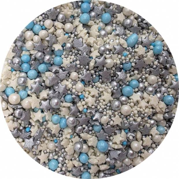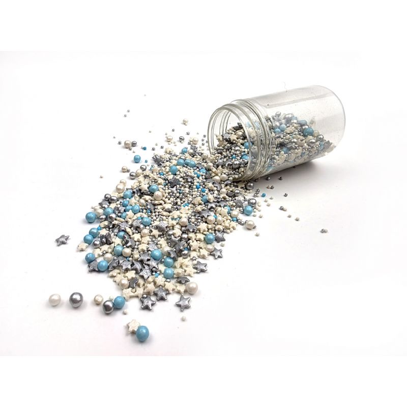 V praktické dóze najdete mix hvězdiček a perliček i stříbrného máčku. Směs oceníte jako doplněk vesmírných dezertů, dortíků na babyshower, pro párty ve stylu Vesmíru, apod. I LOVE CAKES v různých tvarech vám pomohou zajímavým způsobem ozdobit muffiny, dorty, koláče, dezerty, cake pops, sušenky a další sladkosti. Posypky budou krásnou ozdobou pečiva na nejrůznější párty, výročí nebo na dort k narozeninám. Cukrové posypky se budou hodit při přípravě sladkostí na sladký stůl. Posypky jsou baleny v praktické nádobě pro snadné dávkování a skladování. Skladujte na chladném a suchém místě mimo dosah slunečního záření.Pokud zdobení nasypete na vláčný krém, vlhkost z něj může posypek změkčit. Ale pozor, pokud bude zdobení na vlhkém krému delší dobu, může se z posypku uvolnit i barvivo a to na povrch krému. Pokud chcete, aby větší části dekorace drželi například na potahovém dortu, můžete tento druh zdobení k dortům lepit polotuhou čokoládou, nebo glazurou na perníčky. S posypkami pracujte nejlépe nad miskou, či plechem s okrajem.