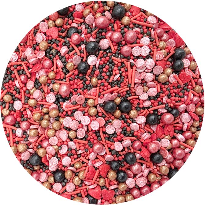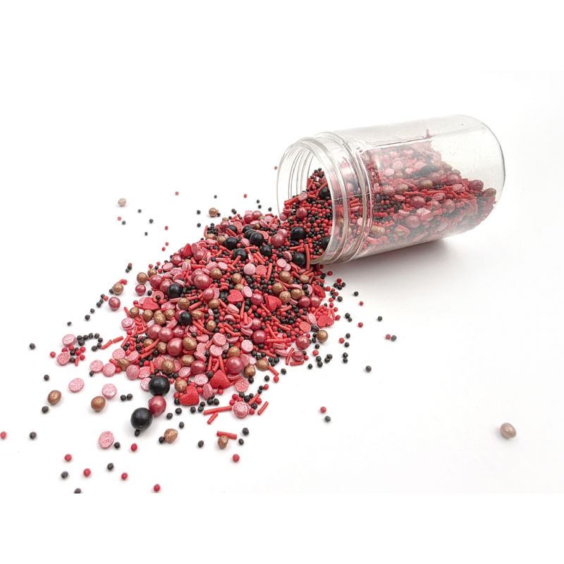 Cukrové zdobení Záblesk lásky je perfektním způsobem, jak dodat dezertům na oslavu narozenin nebo výročí či Valentýna. Skládá se z různých cukrových prvků v v červené, černé a zlaté barvě. Díky svému okouzlujícímu vzhledu s obsahem perliček, máčku, tyčinek a konfet se tato posypka stane ozdobou nejen dortů, ale i cupcaků, dortů, zmrzliny a dalších sladkostí. Tyto barevné prvky jsou jemné, okouzlující a krásně kontrastují se světlou smetanou nebo tmavou čokoládou, čímž dodávají pečeným výrobkům jedinečný vzhled. Proměnit jednoduchý dezert v sofistikovanou cukrářskou dekoraci trvá jen pár okamžiků. Pokud zdobení nasypete na vláčný krém, vlhkost z něj může posypek změkčit. Ale pozor, pokud bude zdobení na vlhkém krému delší dobu, může se z posypku uvolnit i barvivo a to na povrch krému. Pokud chcete, aby větší části dekorace drželi například na potahovém dortu, můžete tento druh zdobení k dortům lepit polotuhou čokoládou, nebo glazurou na perníčky. s posypky pracujte nejlépe nad miskou, či plechem s okrajem.