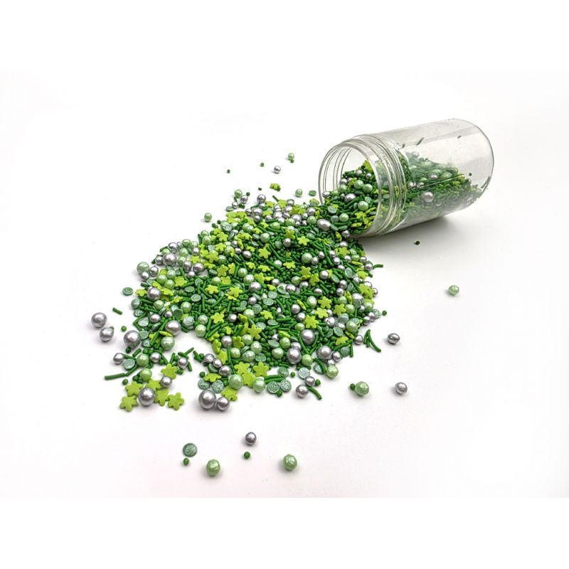 Ať už chystáte dort na den sv. Patrika nebo na Zelený čtvrtek, nezapomeňte ani na pořádnou dávku tohoto mixu sypání v tónech zelené. I LOVE CAKES cukrové sypání v mnoha barvách a tvarech vám pomohou zajímavým způsobem ozdobit muffiny, dorty, koláče, dezerty, cake pops, sušenky a další sladkosti. Posypky budou krásnou ozdobou pečiva na nejrůznější párty, výročí nebo na dort k narozeninám. Budou se skvěle hodit při přípravě sladkostí na slavnostní stůl. Pokud zdobení nasypete na vláčný krém, vlhkost z něj může posypek změkčit. Ale pozor, pokud bude zdobení na vlhkém krému delší dobu, může se z posypku uvolnit i barvivo a to na povrch krému. Pokud chcete, aby větší části dekorace drželi například na potahovém dortu, můžete tento druh zdobení k dortům lepit polotuhou čokoládou, nebo glazurou na perníčky. s posypky pracujte nejlépe nad miskou, či plechem s okrajem. Posypky jsou baleny v praktické nádobě pro snadné dávkování a skladování. Skladujte na chladném a suchém místě mimo dosah slunečního záření.