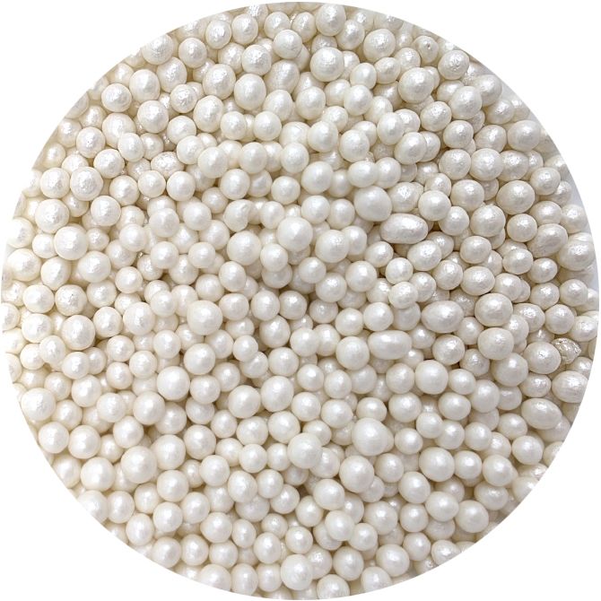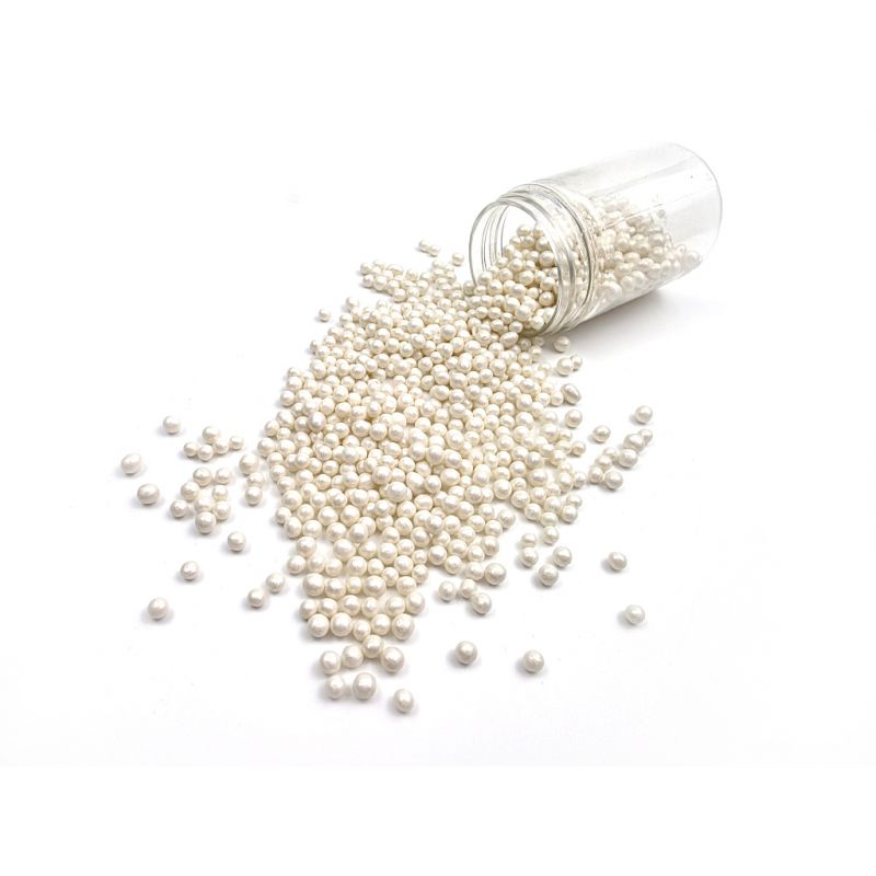 Bílé perleťové perly vyrobené z rýžových lupínků a cukru. Jsou perfektní na zdobení dortů, zmrzliny, zákusků a perníčků. Objevte kouzlo těchto perel, které promění každý dezert v umělecké dílo. Jsou více než jen dekorace - jsou to drobné akcenty, které dodávají lesk a jedinečnost vašim sladkým výtvorům. Jsou vyrobené z nejkvalitnějších surovin. Jejich povrchová úprava je inovativním přístupem k dekoraci, která vyčnívá z tradičních jedlých ozdob. Pokud zdobení nasypete na vláčný krém, vlhkost z něj může posypek změkčit. Ale pozor, pokud bude zdobení na vlhkém krému delší dobu, může se z posypku uvolnit i barvivo a to na povrch krému. Pokud chcete, aby větší části dekorace drželi například na potahovém dortu, můžete tento druh zdobení k dortům lepit polotuhou čokoládou, nebo glazurou na perníčky. s posypky pracujte nejlépe nad miskou, či plechem s okrajem.