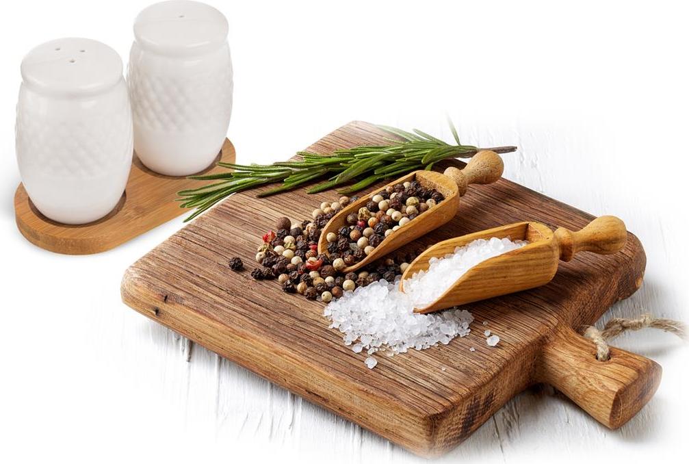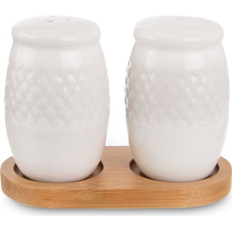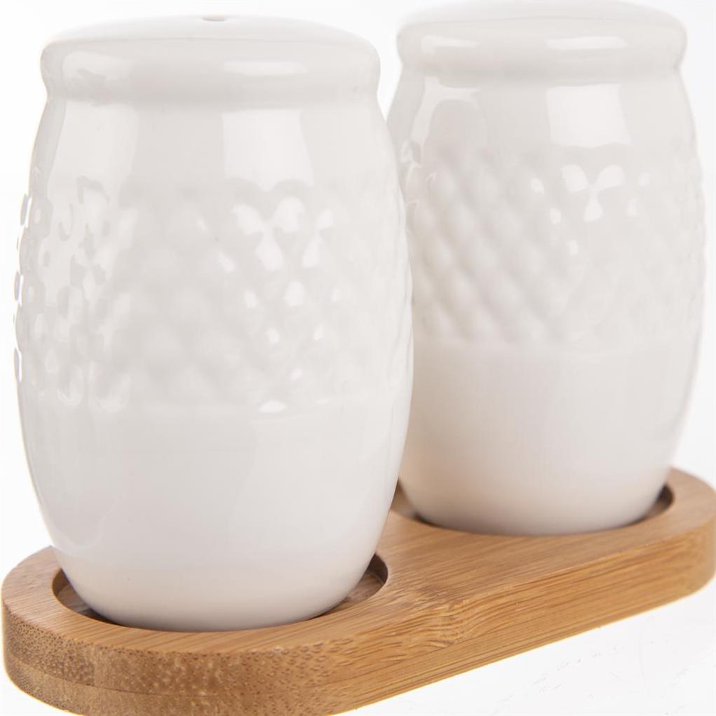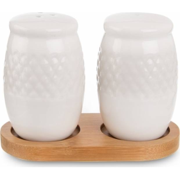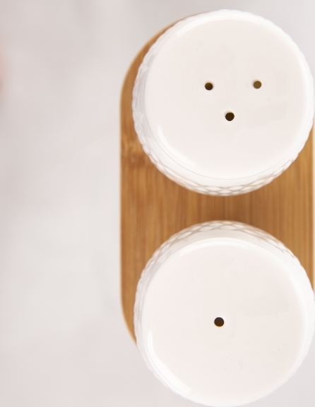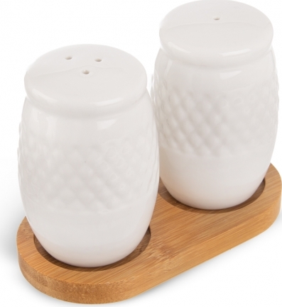 Souprava solničky a pepřenky na stojanu. Materiál: porcelán, bambusové dřevo. Rozměry: kořenka pr. 4,5 cm, v. 7,5 cm, 11,5x6x8,5 cm.