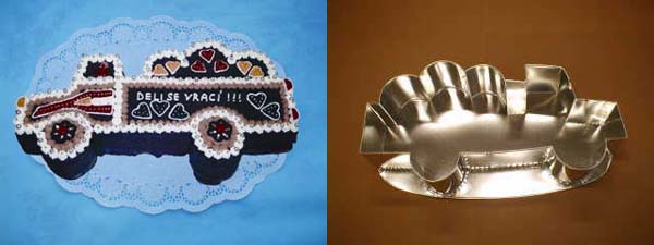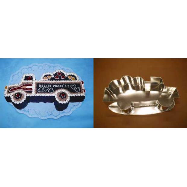 Zábavná forma z pocínovaného plechu ve tvaru siluety nákladního auta včetně nákladu je vhodná do každého typu pečící trouby. Vydrží teploty až do 250°C. Díky rovnému plochému dnu formy se upečený korpus dobře zdobí krémem, ale můžete ho i potáhnout fondánem.