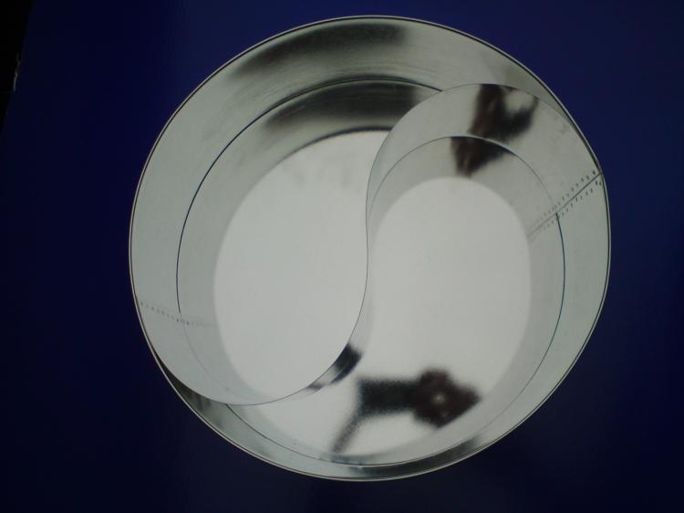 Forma na dort z pocínovaného plechu ve tvaru znaku jing jang o průměru 31 cm.