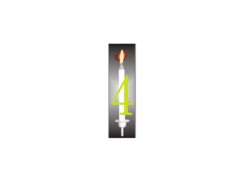 Klasická dortová svíčka s plastovou dekorací ve formě neonově žlutého čísla čtyři. Délka svíčky je 8,8 cm, šířka 8 mm. Reflexní číslo má rozměry 4,6 x 3 cm. V balení najdete kromě svíčky i plastový nástavec se zapichovátkem na dort.