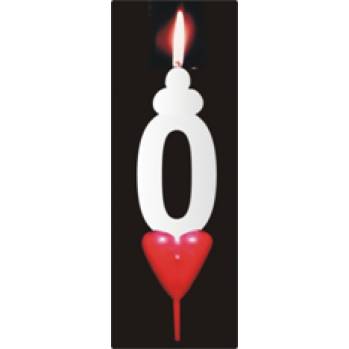 Dortová svíčka ve tvaru čísla NULA s plastovým zapichovátkem ve tvaru srdíčka.