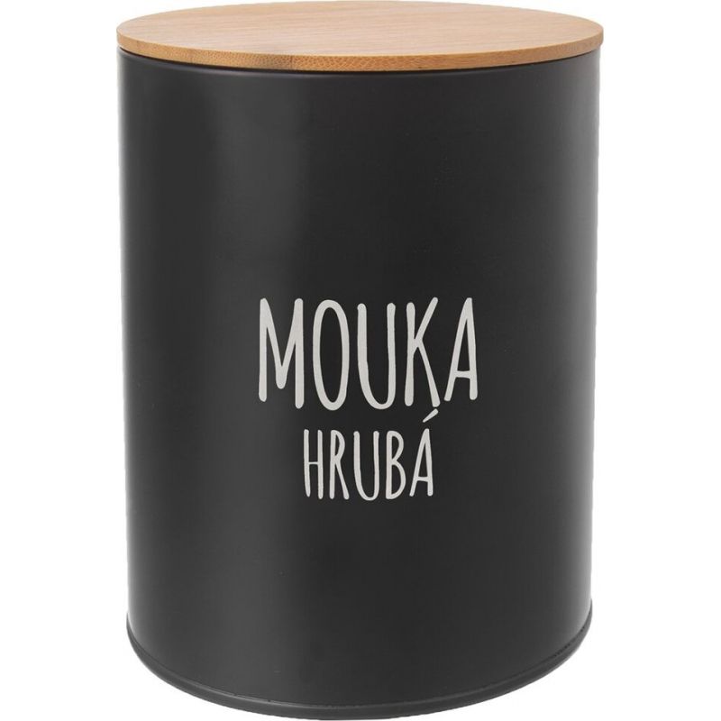 Designová plechová dóza s matným černým povrchem pro uskladnění hrubé pšeničné mouky, vhodné např. na přípravu domácích nudlí, knedlíků nebo noků.
