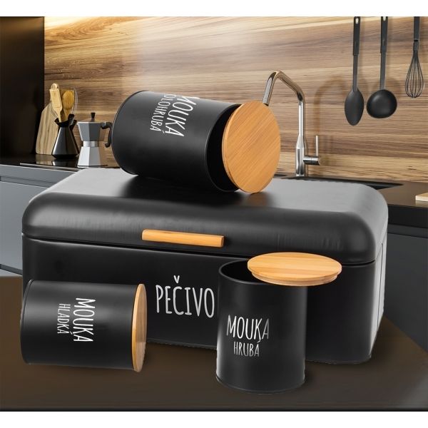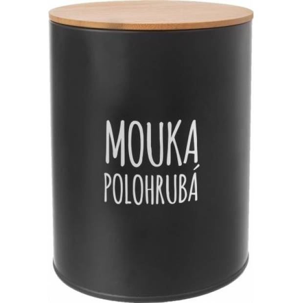 Designová plechová dóza s matným černým povrchem pro uskladnění polohrubé pšeničné mouky, vhodné např .